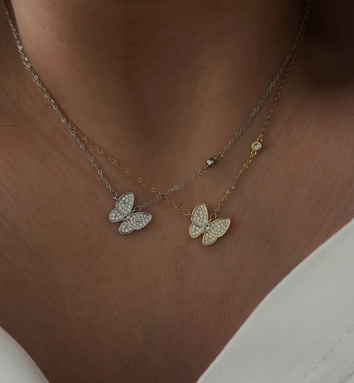 خرید محصول گردنبند نگین دار پروانه نقره ای